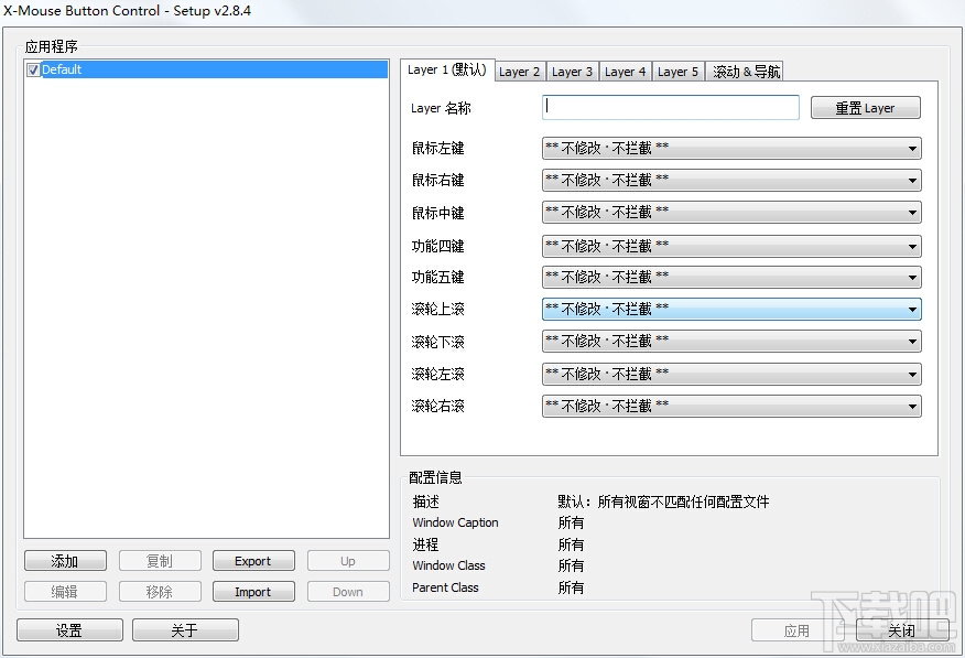 X-Mouse Button Control是一款非常实用的鼠标按键自定义软件,可以修改鼠标每个按键和滚轮所执行的功能,可以针对不同程序配置不同按键功能。还带有保存桌面图标布局的功能。虽然现在大多数鼠标的驱动都自带按键设置,但对于失去驱动支持的老鼠标和标准3键鼠标,这个工具还是很实用的。