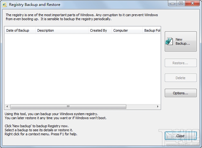 RegBak是一款小巧的注册表备份/恢复工具,RegBak可以自定义恢复注册表中的哪种配置单元。备份时如果遇到错误提示“配置单元已存在于目标文件夹”,您可以重新运行程序给备份文件选择一个新的文件夹。生成的恢复文件默认保存在 C:WINDOWSRegBak 文件夹下,生成的恢复文件夹以备份时间命名,生成的恢复程序是恢复文件夹下的 REGRES.EXE,您可以运行它来恢复注册表。当然,最简单的方法是运行 regbak.exe,在其“恢复备份”选项里搜索备份来恢复。