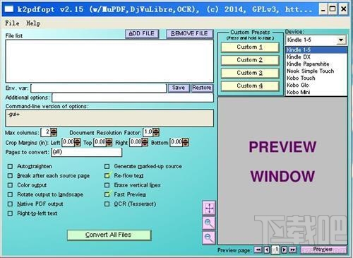 用于 Kindle的PDF转换器 k2pdfopt 的图形用户界面k2pdfopt GUI 是一个有用的应用程序,旨在为您提供前端PDF和DJVU文件优化程序,通过命令行运行。