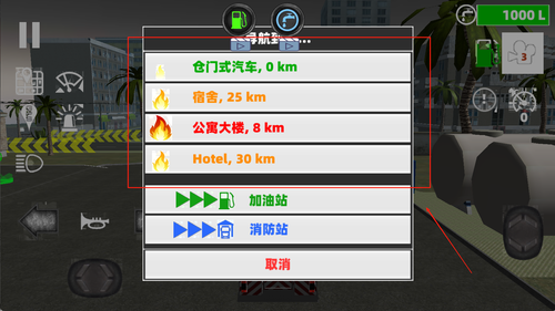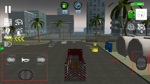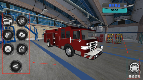 1、进入游戏后选择关卡或任务,点击开始即可驾驶消防车出发,左侧是方向盘控制区,右侧为操作按钮区。
