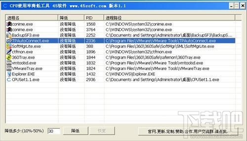 可以设置某个进程的CPU使用率,假如你是双核机器,某个进程使用率50%,再用本软件降低50%,那么再用任务管理器看的话就是25%,本软件对游戏支持良好,可以优化大部分游戏,而且效果明显,设置范围10%-50%,如果对游戏降低的话,cpu会降低很多,FPS会降低一点,非常适合大量多开的游戏或程序,CPU降低后能多开的更多。