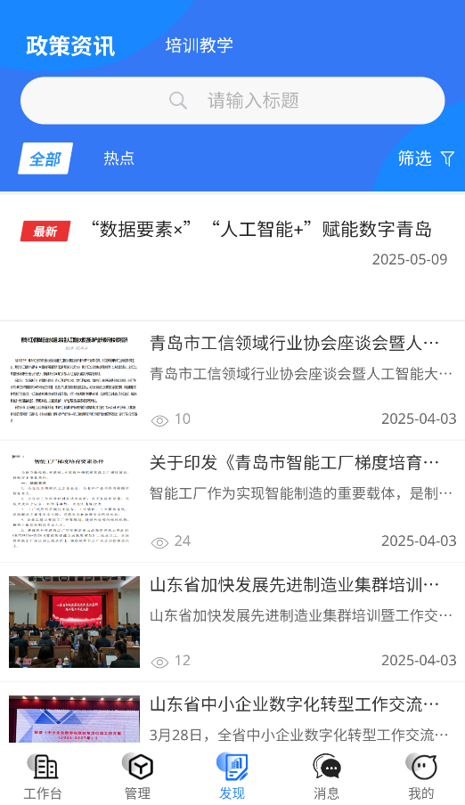 2、通过"发现"板块可查阅最新政策解读文件及企业转型培训课程资源。