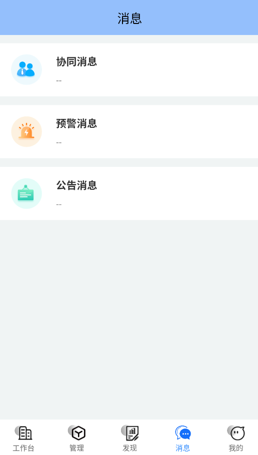 3、"消息中心"分类管理协同办公通知、风险预警提示及企业公告等重要信息。