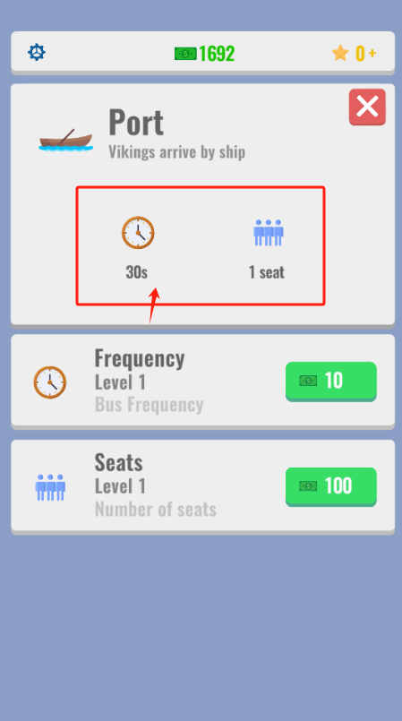 1、点绿色数字10按钮,可以调整港口船只到达频率,数字越大船来得越快。