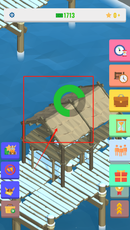 2、点红框里的破旧小屋,花金币可以升级成更好的建筑,赚更多钱。