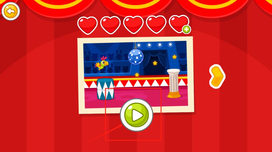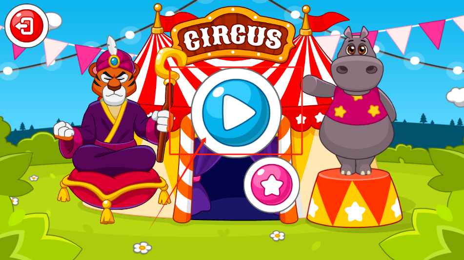 1、点红白帐篷前的绿色播放按钮,看老虎和河马表演马戏,星星是奖励。