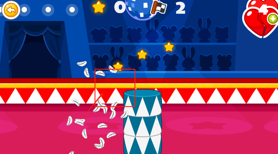 3、点飘羽毛的蓝桶,收集星星得分,注意心形血条别掉光。