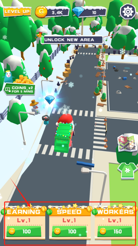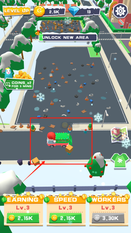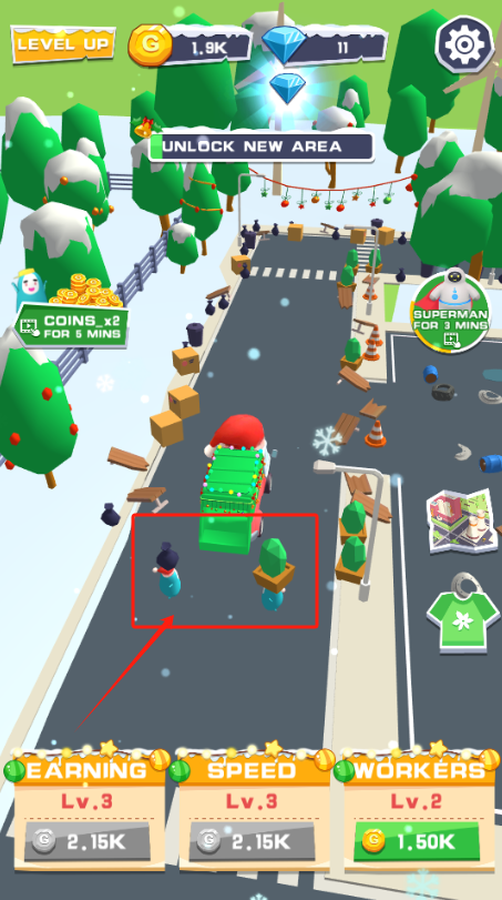 2、圣诞老人卡车正在工作,现在收益和速度都升到3级了,工人还差一级。