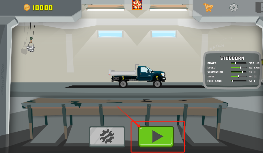 1、点绿色播放按钮开始游戏,钱够就点齿轮升级卡车性能。