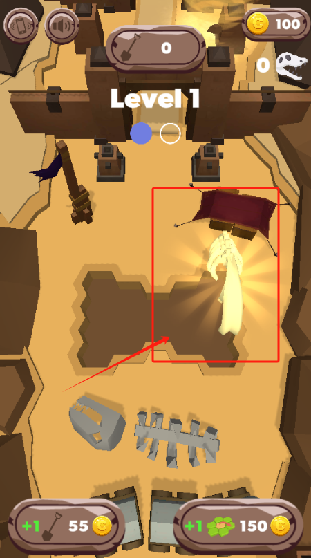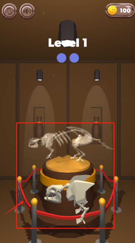 2、中间展出恐龙化石,点击音效按钮开关声音,注意看金币数量。