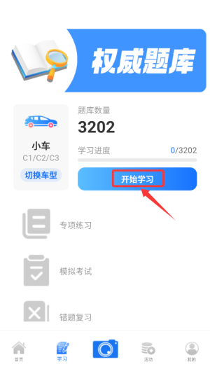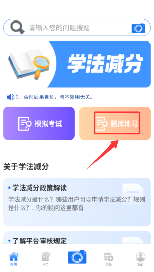1、启动学法减分速通APP后,在首页功能栏选择"题库练习"模块,进入学习界面。