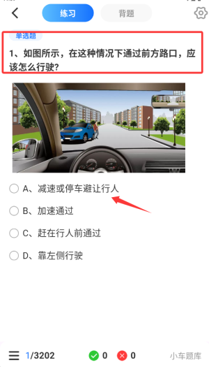 2、点击"开始学习"按钮,系统将随机生成交通法规相关题目供用户作答。