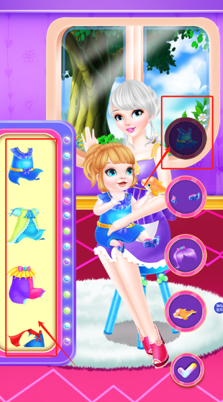 3、点衣服图标给萌宝换装,选好按对勾确认。
