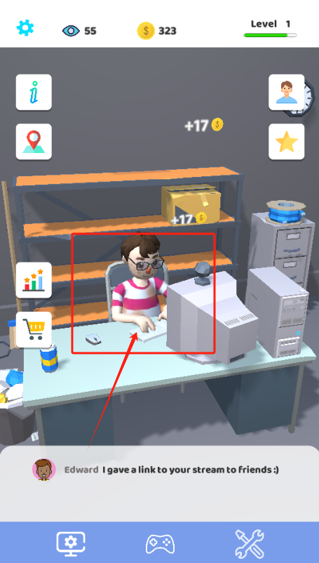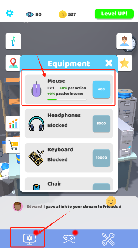 2、选设备升级鼠标提高属性,其他设备需要解锁,底部能看到观众聊天消息。