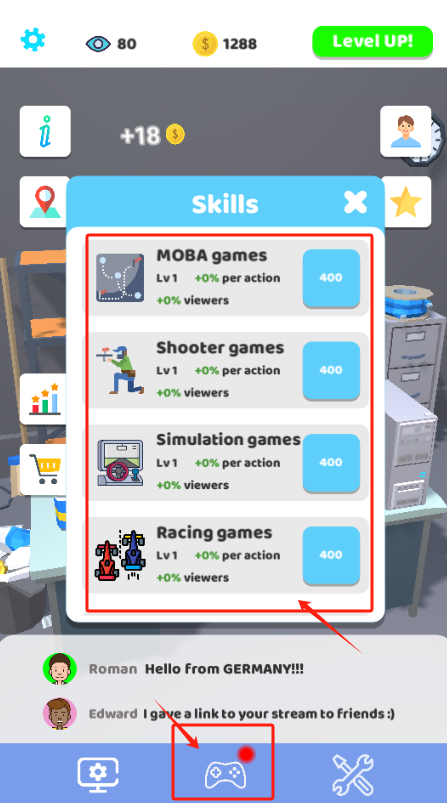 3、花400点升级MOBA或射击游戏技能,提高直播效果,观众Raman在打招呼。