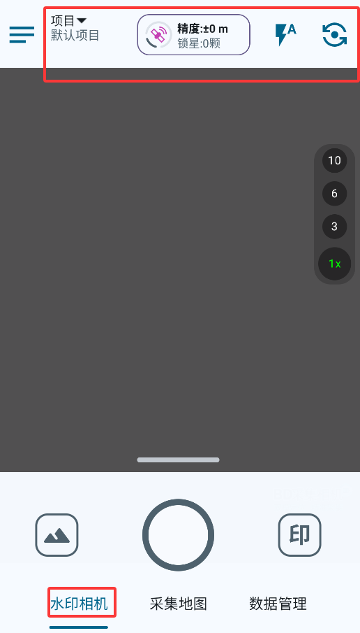 1、启动APP后进入拍摄界面,底部功能栏提供水印设置、数据管理和地图定位等实用工具。