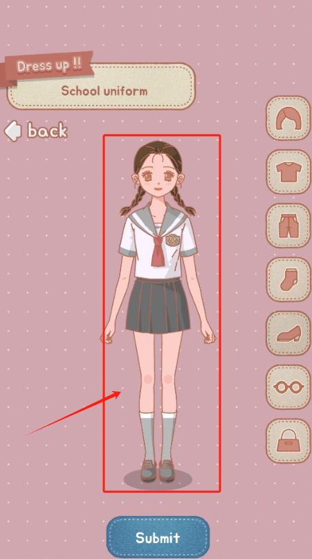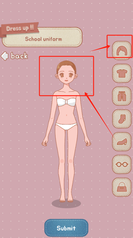 2、选右边头发图标换发型,点蓝色Submit提交装扮好的校服造型。