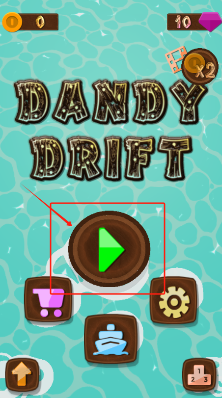 1、是游戏开始界面,点中间绿色箭头按钮开始游戏,右上角紫色宝石有10个,金币是0。