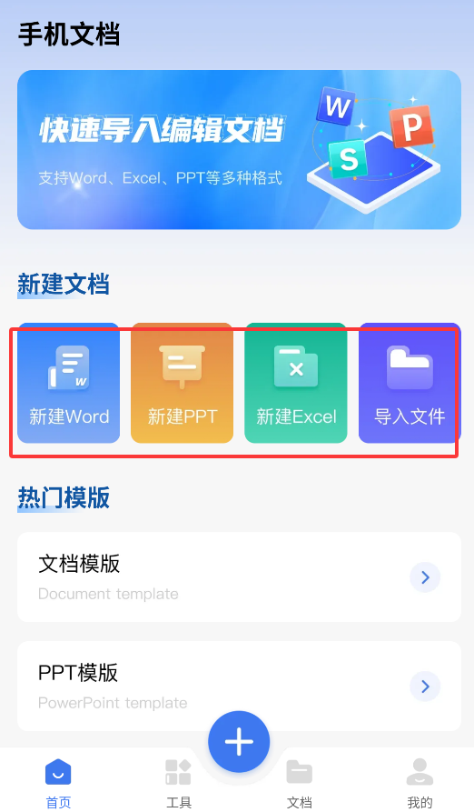 1、启动APP后,点击"新建"按钮可选择创建Word、Excel或PPT文档,也支持导入本地文件进行编辑。