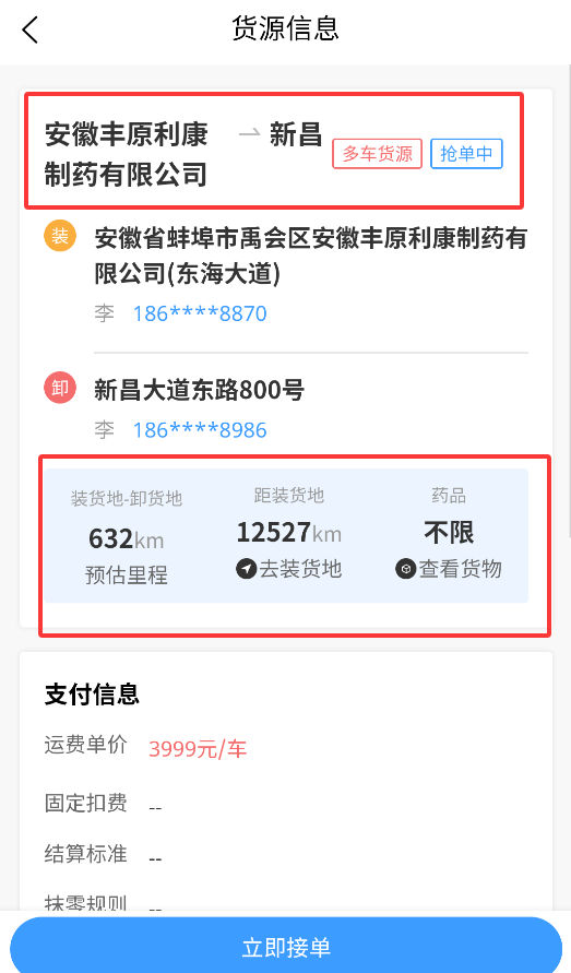 2、订单详情页清晰显示起止地点、货物类型、预估运费及里程等关键信息,方便评估接单。