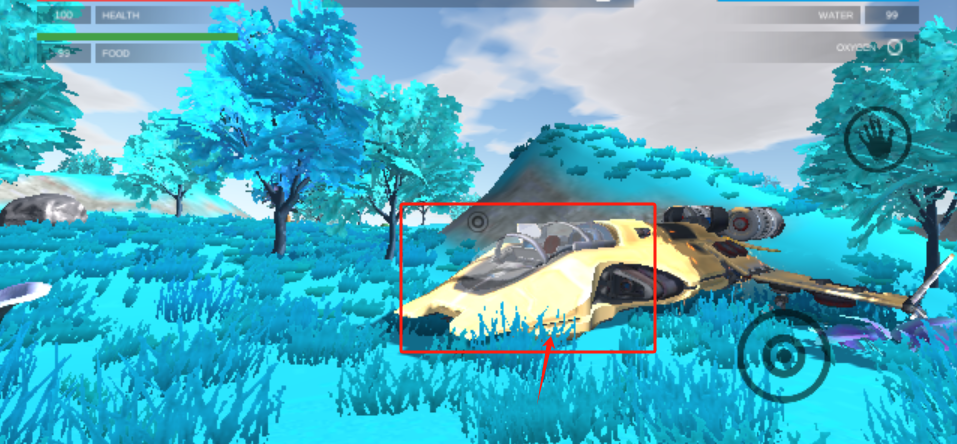 2、控制角色在草地探索,看上方健康值,右下角按钮操作,黄色飞行器可以互动。