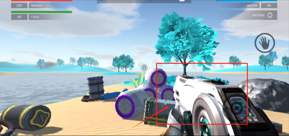3、点红框里的白色装置使用,前面彩色圆环是任务目标,注意上方生命值和资源数值。