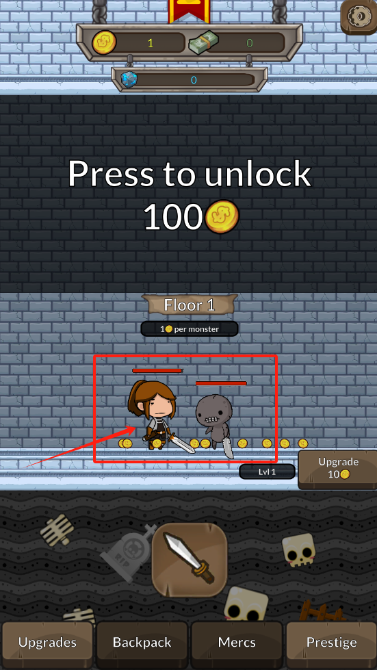 3、角色1级打小怪,攒100金币解锁新内容,下面有升级、背包等功能按钮。
