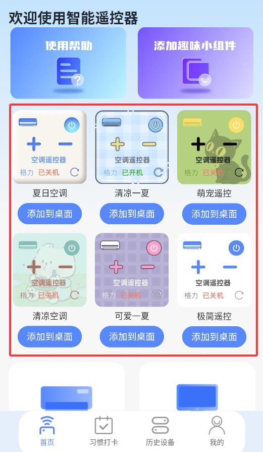 1、启动APP后,在主题中心选择喜欢的遥控器皮肤(如卡通、极简风格),一键设为桌面快捷控件。