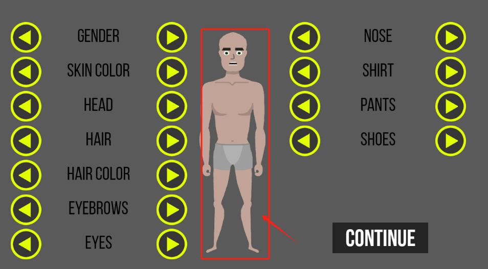 2、角色创建界面,可以调整性别,发型等外观选项,设置完成后点CONTINUE继续。