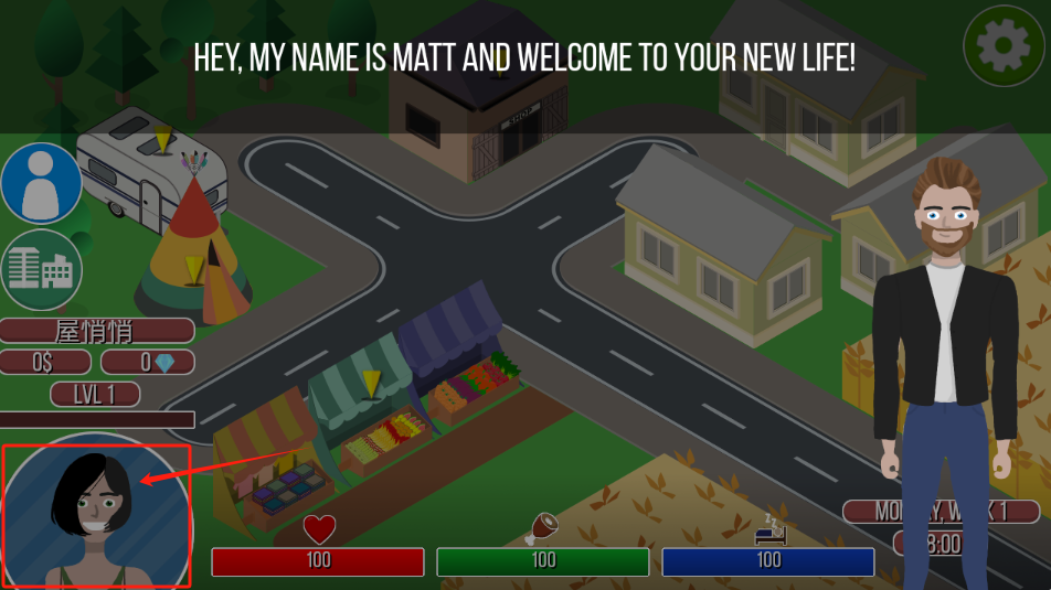 3、游戏主场景,左侧女性角色被标记为重点,右侧站着NPC马特,下方显示角色状态和时间。