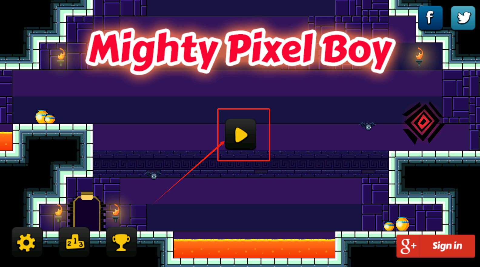 1、点红框里的黑方块开始游戏,左下角可以选关卡。