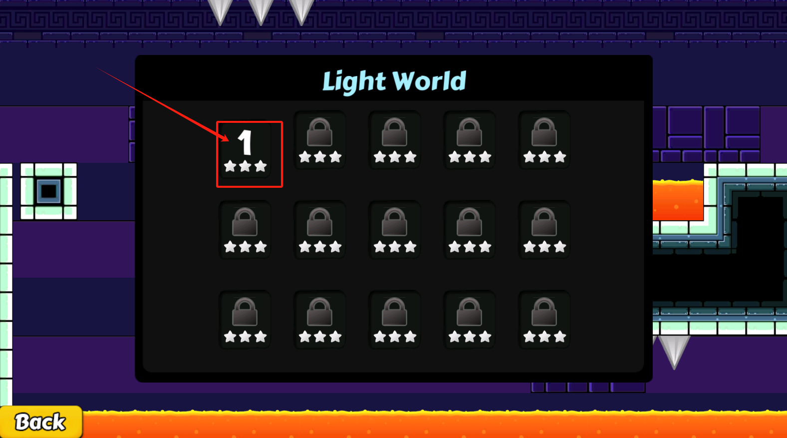 2、选红框标出的第1关开始玩,锁住的关卡要解锁才能玩,点Back返回。