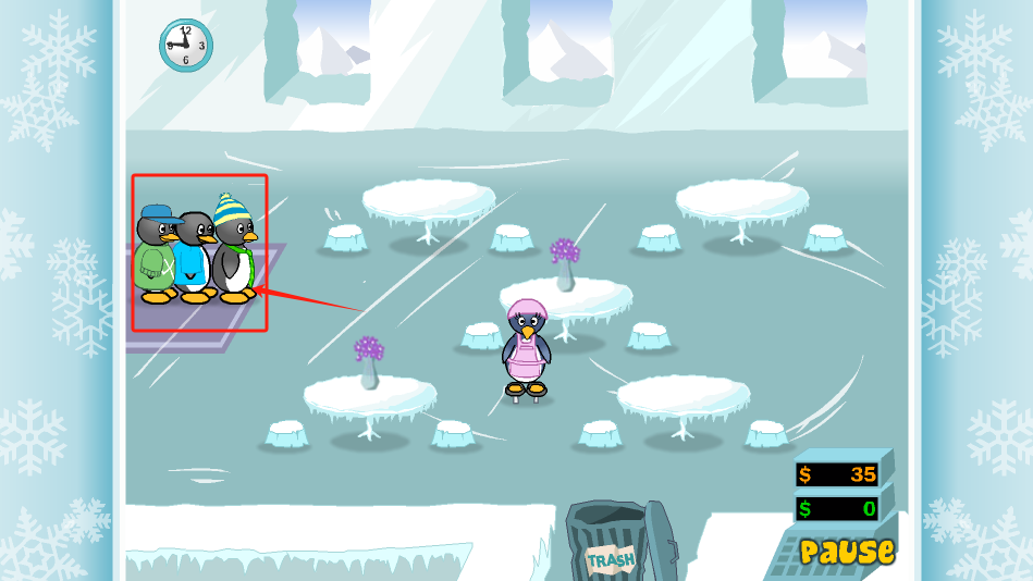 3、控制企鹅服务员上菜,注意右上角时间,右下角显示有35块钱。