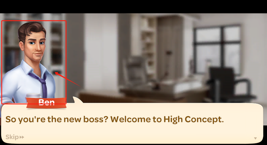 2、看蓝衬衫角色对话,点Skip跳过剧情,右边有其他选项按钮。