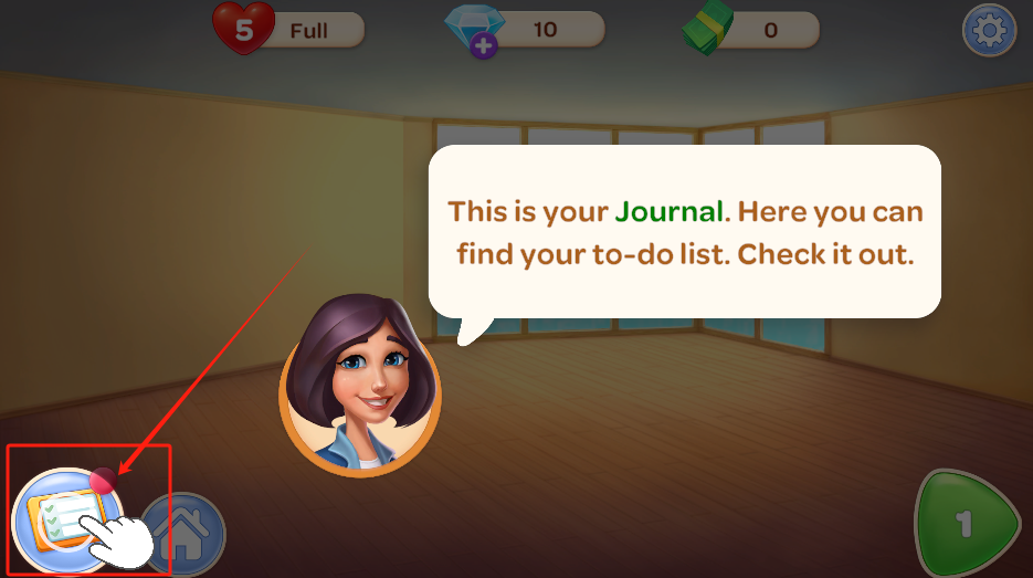3、点红框里的日记本图标看任务,左上角显示5颗爱心和10钻石。