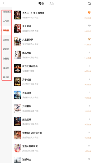 1、启动坚果小说APP后,在首页导航栏选择"完整榜单"栏目,这里展示各类热门小说排行。