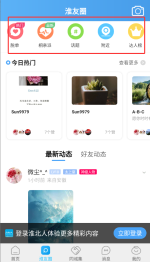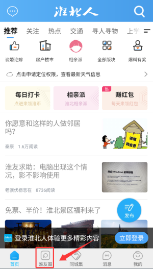 1、进入淮北人APP后,在首页导航栏选择"淮友圈"栏目,这里汇集本地各类社区话题。