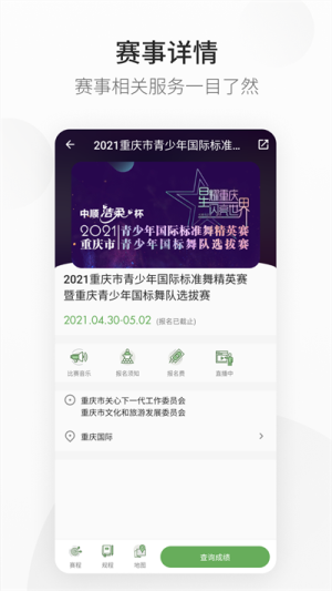 1、资源优势突出,赛事信息更新及时准确。与多个舞蹈协会保持合作,确保内容的专业性和权威性。