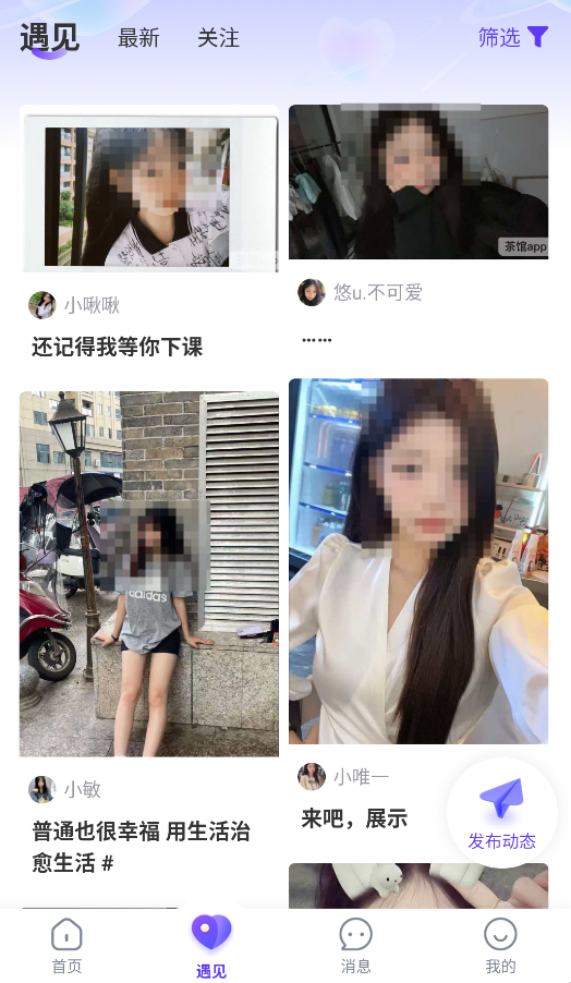 3、动态广场支持图文、语音、短视频等多形式分享,搭配AR滤镜与情绪标签,让生活记录更生动,吸引志同道合的伙伴。