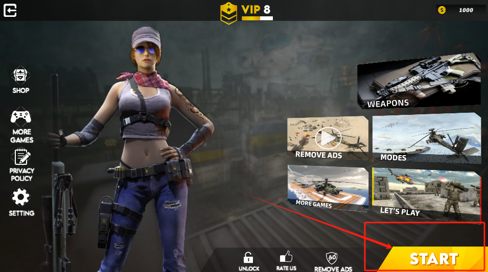 1、点黄色START开始游戏,左边能买装备,右边选武器和模式。