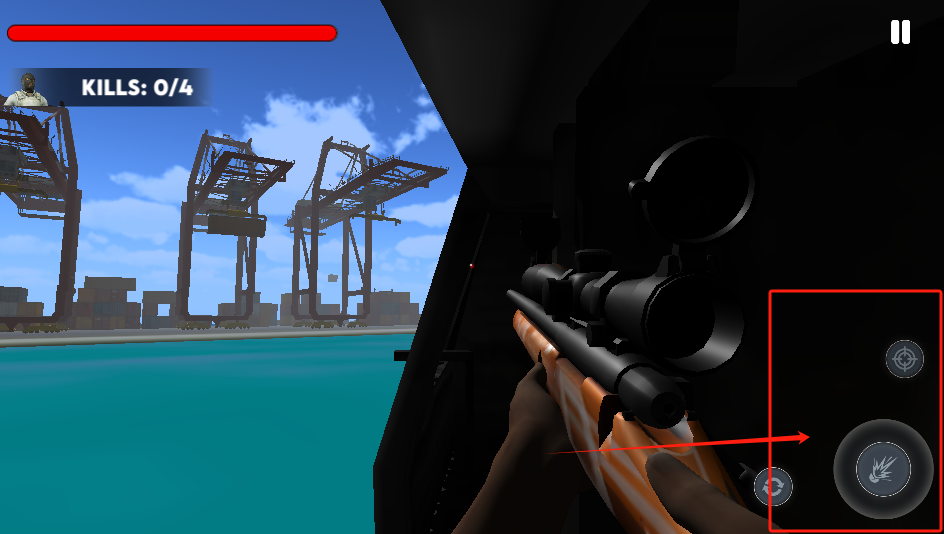 3、用枪瞄准码头敌人,看右下角按钮射击,杀够4个过关。