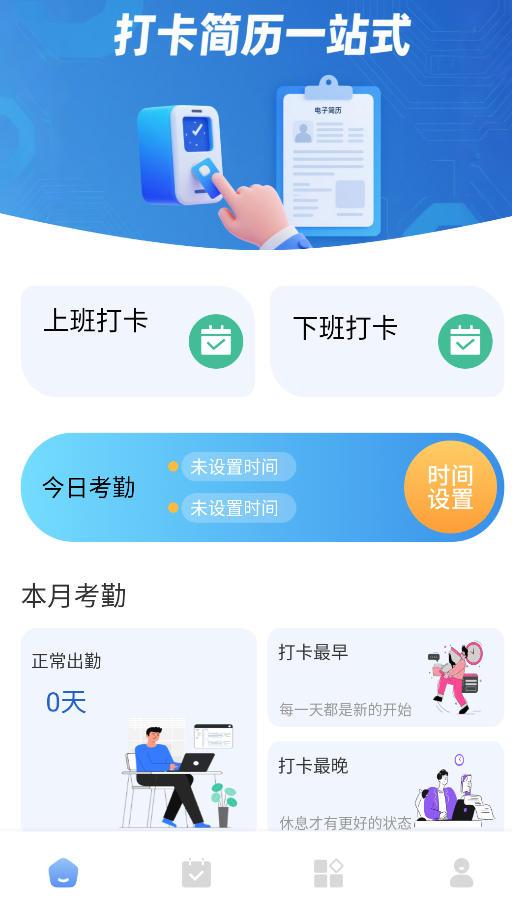 2、主界面采用三栏式布局。顶部为实时打卡按钮,中部显示当月出勤率扇形图,底部可切换学习/简历功能模块。
