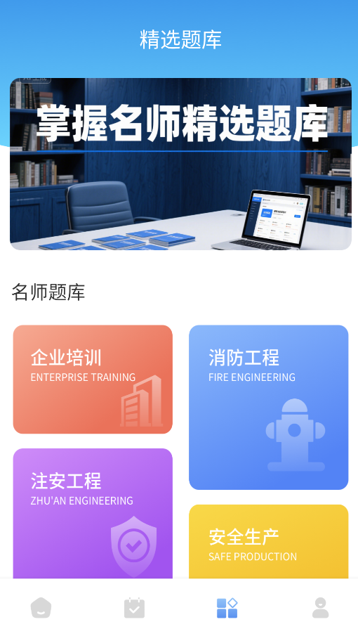3、"学习中心"提供行业权威课程库,包含企业内训视频、消防工程师题库及注册安全工程师备考资料等专业内容。