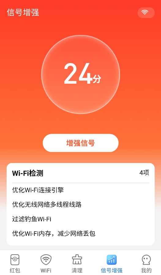 3、网络优化模块可一键检测信号强度,通过信道优化技术提升WiFi/移动数据连接稳定性。