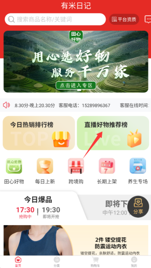 1、进入有米日记APP后,在首页导航栏中找到并点击"好物推荐"频道入口。