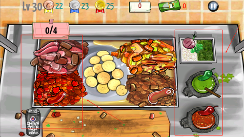 2、点击食材区域选择所需材料进行切割、腌制、煎烤、组合等操作,按照提示完成订单并及时上菜。