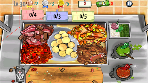 2、左侧是厨房操作区域,包括切菜、煎烤、调味等功能按钮,右侧则是顾客点单与倒计时显示区。
