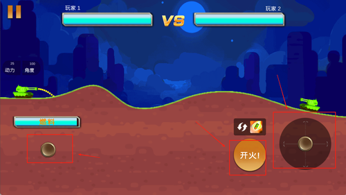 2、左侧控制坦克移动方向,右侧进行瞄准与射击操作,点击按钮完成发射炮弹、躲避攻击等关键动作应对战场变化。