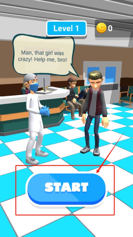 1、点蓝色START按钮开始第一关,听病人说有个疯狂女孩,先了解情况。