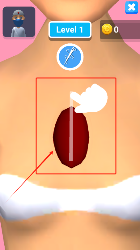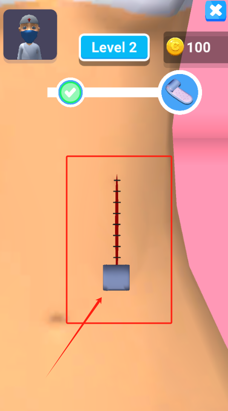 3、第二关要用缝纫机缝合伤口,看箭头操作,赚了100金币别乱花。